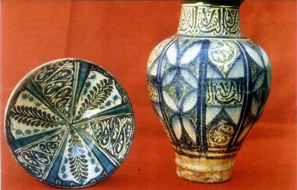 Two pieces of the famous Damascene pottery decorated by geometric ornamentation and plants drawings; they were manufactured in the 14